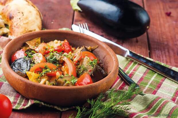 В эмалированную, керамическую или стеклянную глубокую форму выложите слой обжаренных баклажанов. На него слой пережаренных овощей с томатами и специями. Снова слой баклажанов и так же чередуя слои выложите всё до конца. Верхний слой обязательно должен быть из пережаренных овощей и специй с томатами. Сверху посыпаем густо мелко порезанной зеленью. Даем настояться 30 минут после чего подаем к столу.